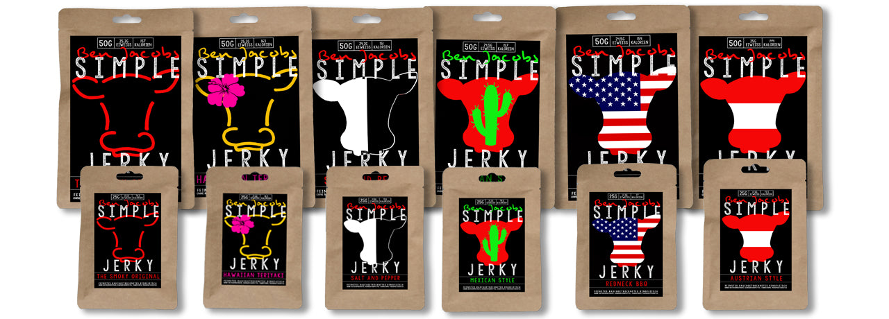 Nel nostro negozio offriamo 11 varietà diverse: da mix di spezie tradizionali americane a preparazioni con un tocco europeo. Qui c'è tutto ciò che il cuore del Jerky desidera.
