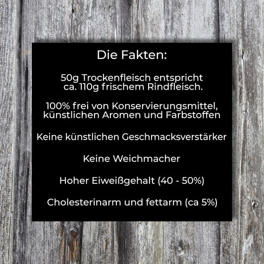 Il nostro Beef Jerky non è un cibo dietetico, ma è un alimento ad alto contenuto proteico, che ti conquisterà con un sapore estremamente buono. Il contenuto di proteine è davvero notevole: In 100 grammi di Beef Jerky ci sono circa 50 grammi di proteine . Puoi gustare questa carne secca saporita praticamente ovunque e in qualsiasi momento, a casa e al lavoro, in viaggio in auto e durante le attività ricreative. Realizzato con la migliore carne di manzo e senza additivi superflui, possiede il carattere intenso e saporito del Biltong.